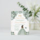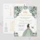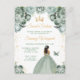 Esta elegante y glamurosa invitación de cumpleaños para dulces dieciséis presenta a una hermosa princesa con piel oscura en un vestido de gala verde sage. El texto combina letra manuscrita y fuentes modernas sans serif para un look clásico y sofisticado. Los arreglos florales, la mariposa y el confeti dorado crean la mezcla perfecta de rústico y chic. Gráficos por www.etsy.com/uk/shop/SunflowerDayLove