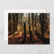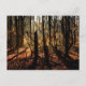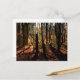 Salida del sol en el bosque del invierno con los árboles y las sombras, postal