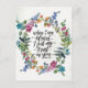 La postal de la escritura inspiradora representa una corona de color bonito con flores y vegetación de color azul natural, rosa y naranja. Presenta el Salmo de la Biblia Verse 56:3, "Cuando tengo miedo, deposito mi confianza en ti".