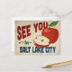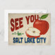 Una encantadora postal de viaje de la ciudad de Salt Lake City Utah con una hermosa manzana roja, junto con un divertido texto de estilo retro que dice: "Nos vemos en Salt Lake City"