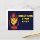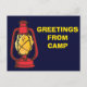 Mantente en contacto con amigos y parientes con estos lindos saludos de la postal del campamento. Esta postal tiene un fondo azul marino y un ilustracion de una linterna roja. El texto marrón de la parte delantera se puede personalizar o personalizar utilizando el campo de texto en blanco. Hace un regalo divertido para los niños que van al campamento de verano.