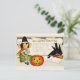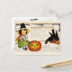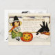 ¡Vieja postal de Halloween mostrando una linda bruja desesperada, porque no sabe volar! La niña está vestida con un gorra de brujas y una capa y está sentada en su escoba, que se balancea sobre una calabaza de linternas. También hay dos cuervos y un fantasma.
