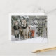 Una hermosa foto de dos caballos tirando de un trineo a través de un bosque de invierno, con las palabras "Saludos de temporada para ti y los tuyos"