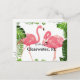 Saludos desde Clearwater, FL, diseño tropical con hojas de palma y hermosos flamencos rosados