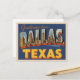 Esta es una postal clásica de estilo vintage que presenta la frase "Saludos desde Dallas, Texas". Las grandes y estilizadas cartas de DALLAS contienen una escena única o un punto de referencia de la ciudad, incluyendo su impresionante horizonte del centro. El diseño tiene un estilo nostálgico, a mediados de siglo, con su paleta de colores retro y su letra audaz, lo que lo hace perfecto para productos como postales, posters y camisetas para todo aquel que ame el arte de viajes vintage o la vibrante ciudad de Dallas.