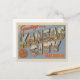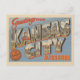 Esta es una postal clásica de estilo vintage que presenta la frase "Saludos desde Kansas City, Missouri". Las grandes y estilizadas letras de KANSAS CITY contienen cada una una escena única o un punto de referencia de la ciudad, incluyendo sus famosos edificios y el paisaje urbano. En la parte inferior izquierda se incluye un sello circular adicional que dice "Kansas City Missouri". El diseño tiene un estilo nostálgico, a mediados de siglo, con su paleta de colores retro y su letra audaz, lo que lo hace perfecto para productos como postales, posters y camisetas para todo aquel que ame el arte de viajes vintage o la vibrante ciudad de Kansas City.