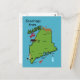 Saludos desde Maine con un mapa de Maine y iconografía clásica de Maine, langostas, faro y alce.