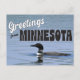 Saludos desde Minnesota con el pájaro del estado el Lomo Común nadando en un lago y Saludos en un tipo retro.