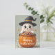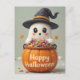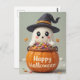 Envía una fantasmal cortesía con esta tarjeta de Halloween que muestra un fantasma saliendo de una calabaza, con un pequeño gorra de brujas. ¡Dulce y espeluznante diversión!
