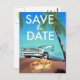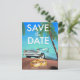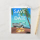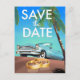 Postal Salva la fecha coche antiguo y anillos de boda.
