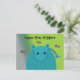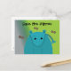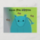 Un lindo hipopótamo azul con cara dulce. Un fondo verde azul y sombreado con flores marrones y rosas a su alrededor. En esta postal se puede cambiar el dicho "Save the Hippos" (Salven los hipopótamos).