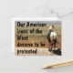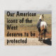Nuestros mustangs salvajes son íconos estadounidenses de Occidente. Merecen vivir salvajes y libres en las tierras donde nacieron. Pero en cambio, nuestros caballos salvajes están siendo acorralados a un ritmo sin precedentes hasta el punto de extinción en el campo, y ahora necesitan nuestra ayuda. Únase a nuestra Campaña Salvemos a nuestro Caballo Salvaje y envíe una postal a los miembros de la Cámara de Representantes de sus estados, a los senadores de sus estados, al presidente de Estados Unidos, al vicepresidente de Estados Unidos, al Servicio Forestal de Estados Unidos, a la oficina regional del BLM en su área y al jefe del Departamento del Interior. Díganles que nuestros caballos salvajes no merecen los inhumanos y crueles redadas de helicópteros, nuestros caballos salvajes no merecen ser separados de sus miembros durante el resto de sus vidas, nuestros caballos salvajes merecen vivir en nuestras tierras públicas en sus áreas de manejo de manadas con acceso al agua, y mantener al ganado, petróleo y minería lejos de los Caballos Salvajes y Burros HMA's.