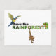 Salven las selvas tropicales escritas en una colorida gráfica con un macao, una rana arbórea y un mono a su alrededor.