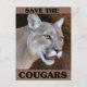 Un primer plano de un cougar con las palabras "Salven a los Cougars" que lo rodean.