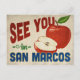 Una encantadora postal de viaje vintage de San Marcos California con una hermosa manzana roja, junto con un divertido texto de estilo retro que dice, "Nos vemos en San Marcos"