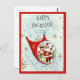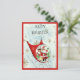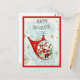 This pattern features a charming, vintage-style holiday design on a light, speckled blue and white background dotted with gold snowflakes. The central motif is a red helicopter shaped like a sleigh, with a clear cabin inside that showcases a classic depiction of Santa Claus waving alongside a reindeer. The words "HAPPY HOLIDAYS" are printed across the pattern in a dark, slightly distressed script, creating a repeating, festive textile design reminiscent of mid-century Christmas wrapping paper or fabric.