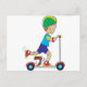 Un niño monta su moto con un perro mascota a su lado del pie, con la cola hacia arriba y las orejas soplando en el viento.