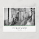 Foto postal de una motocicleta vintage estacionada frente a una casa en una calle adoquinada en la ciudad de Florencia (Florencia) en la Toscana en Italia en elegante blanco y negro con un borde blanco y en una caja blanca el texto 'Firenze, Toscana'. Tiene rayas verdes, blancas y rojas, con los colores de la bandera italiana.