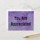 Hágale saber a sus empleados dedicados que son apreciados con esta tarjeta postal económica con un fondo abstracto de mármol morado. "Usted Es Apreciado" aparece en la parte frontal y se puede personalizar fácilmente. La parte posterior ofrece mucho espacio adicional para el nombre de su empresa, logotipo o mensaje personal.