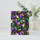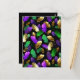 Seamless pattern of bright purple, green, and gold feathers on black Mardi Gras background. Design for the Mardi Gras holiday.