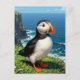 A sweet puffin postcard that has a cute illustration of a puffin sitting by the sea on an seaside dune or ledge.