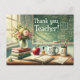 ¡Aquí tienes tu tarjeta postal de la Semana de Agradecimiento a los Maestros con estilo de acuarela! 🎨📚 La imagen presenta una pizarra vintage con caligrafía blanca elegante que dice "¡Gracias, Maestro!", junto con elementos clásicos de manzana y libro en un ambiente acogedor de aula.