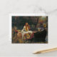 Pintura de arte fino y vintage de la Señora de Shalott (1888) sobre el agua en un barco ornamentado. Señora de Shalott vestida con un vestido blanco completo. Arte del artista inglés John William Waterhouse.