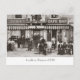 Magnífica foto de c1900 a 1910 de una fachada de una cafetería en Francia. No tengo idea de dónde está, podría ser París o una ciudad grande. Hay dos señoras bien vestidas con sombrillas y un hombre sentado en la mesa. En el otro hay tres hombres y un niño, de pie en el fondo, dos empleados del bar cafetería y un muchacho. Al lado, probablemente parte del mismo establecimiento, hay un coiffure (peluquería) con dos grupos de personas en el exterior. Las damas tienen un perro pequeño. Encima del salón hay un cartel que dice Archier, y en el centro, el Arrivage d'huitres tous les samedis - ostras que llegan todos los sábados. Encima de la cafetería y del salón hay tres ventanas con un balcón en el centro. La gente en el balcón ha sido recortada pero aún se puede ver la cara de un niño pequeño, y en la ventana de la derecha, alguien está sosteniendo un periódico con la palabra Journal en él. A la derecha del cartel de Cafe Bar, hay un viejo cartel pintado, pero solamente puedo entender las palabras café, vins y posiblemente Chez Alise.
