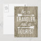 Sé viajero, no turista. Comparte tu amor por los viajes con nuestra postal de moda global que incluye la cita en la tipografía de monolina blanca con dos ilustraciones de flecha. El fondo es un mapa del mundo de sepia tone vintage de 1708.