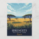 A vintage travel poster illustration depicting the Serengeti National Park in Tanzania. The scene features a vast, sunlit savanna landscape with iconic flat-topped acacia trees, tall grasses in the foreground, and a clear, cloudy blue sky overhead. The bottom section is dark blue with the title "SERENGETI NATIONAL PARK" and "Tanzania" in gold script.