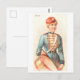 Esta postal presenta una reproducción de una tarjeta de comercio vintage que muestra a una mujer como tamborilera. Es la tarjeta #35 de la serie Mujeres Fuertes.