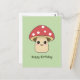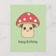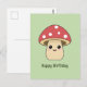 Una tarjeta postal de cumpleaños verde con una ilustración de una seta bonita en estilo caricatura y texto personalizable debajo. Podría ser perfecta para enviar a un niño, un micólogo o un amigo que ama los personajes Kawaii y la naturaleza.