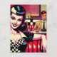Una sexy vampiresa con el pelo blanco y negro sentada en una cabina roja en el comedor retro mientras un hombre inconsciente disfruta de su comida en el fondo fantasía arte generado por IA