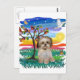 Se muestra un cachorro shih zu contra un cielo de colores brillantes y un sol brillante. Un cardenal y un pájaro azul cantan en un árbol que brisa suavemente.