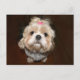 cara de shih tzu, arco rosado sosteniendo un poco de pelo hacia arriba, triste o solitario o tal vez apariencia de mendicidad