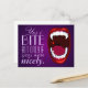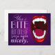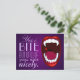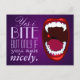 Espectacular cámping de horror tipo arte, dientes de vampiros, colmillos demonios o monstruos, un estruendo de horror estilo libro de historietas de una boca abierta con dientes caninos alargados de brillante blanco, una gota roja de sangre, labios rojos, fondo degradado violeta profundo y texto púrpura pálido. Una muestra del humor vampiro con fuentes elegantes y divertidas. Puede utilizar la función personalizar para cambiar el estilo, el tamaño o el color del tipo de letra si lo desea. Esta tarjeta postal es muy buena enviada como una riña entre amigos o colgada como arte mural, para vampiros, señores y damas oscuros y otras criaturas sedientas de sangre de la noche.