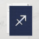 Un signo zodiacal de Sagitario plateado y cromado sobre un fondo de impresión de textura de fibra de carbono azul marino estilo automotriz. Un diseño urbano moderno y emocionante para una excelente idea de regalo de cumpleaños personalizado.