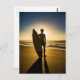Un surfista de pie en la playa, con tablas de surf en la mano, frente al océano, colocado frente al sol naciente.