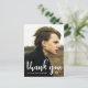 Tipografía de agradecimiento simple en blanco con foto completa en el frente, y un dulce mensaje de agradecimiento con una estrella de David azul y dirección de remite en la parte posterior de la postal.