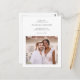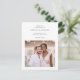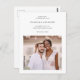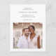 Sencilla y minimalista dos bodas en blanco y negro, salvo la postal de fecha, que incluye tipografía clásica y una foto delantera de la tarjeta, con detalles del sitio web del boda, una segunda foto y la dirección de retorno de la novia y el novio en la parte posterior de la tarjeta postal de invitación de fecha del boda.