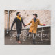 La parte delantera de esta simple y moderna tarjeta postal de anuncio Guardar la fecha presenta un texto de escritura blanca sobre una foto horizontal completa de la pareja, con los nombres y fechas debajo en letra blanca sans serif. Personalice la parte posterior con nombres, fecha de boda, dirección URL del sitio web y otra información, junto con su dirección de retorno.