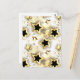 Patrón inexorable de joyería, oro y estrellas negras sobre fondo texturado claro. Estrella dorada.