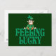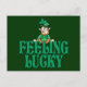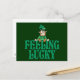 Este diseño de San Patricio presenta un lindo leprechaun irlandés sentado encima de la leyenda "Feeling Lucky" en un texto verde grande.