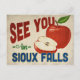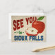 Una encantadora postal de viaje vintage de Sioux Falls en Dakota del Sur con una hermosa manzana roja, junto con un divertido texto de estilo retro que dice "Nos vemos en las Cataratas Sioux"