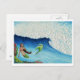 Hermosa sirena en el océano rodeada de coloridas flores hawaianas mientras admira una onda impresionante.
