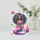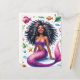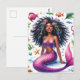 Esta vibrante postal de fantasía presenta ilustraciones en acuarela de una sirena 'negra' rodeada de vida marina. La criatura marina de piel marrón oscura posa en el fondo marino con una hermosa sonrisa, luciendo una parte superior púrpura. Tiene una cola escamosa de color rosa y está rodeada de peces, estrellas de mar, burbujas y otras criaturas oceánicas y elementos botánicos. La hermosa sirena tiene cabello grueso, largo y naturalmente rizado que se extiende desde su radiante rostro rico en melanina en la escena submarina.