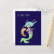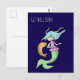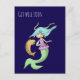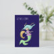 Tarjeta postal de mejora con fondo azul marino con una ilustración de una sirena con un brazo roto. El pececito está agregando algo de arte en su yeso. El sentimiento dice "Mejora pronto" pero puedes personalizarlo y personalizarlo aún más para cambiar la fuente, su color y tamaño.
