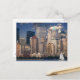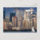 Fabulosa foto del perfil de la ciudad de Nueva York por la noche. La imagen tiene un barco de vela en el paseo marítimo en primer plano y el fondo está poblado con los muchos edificios y rascacielos brillantes e interesantes. La foto se tomó al atardecer cuando el cielo nocturno tiene un aire crepúsculo.