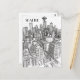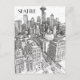 Esta postal de viaje, en forma de boceto dibujado a mano, muestra una vista del horizonte de Seattle.