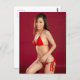 A swimsuit model poses confidently in a red bikini against a matching red background. Her expression is friendly and inviting.